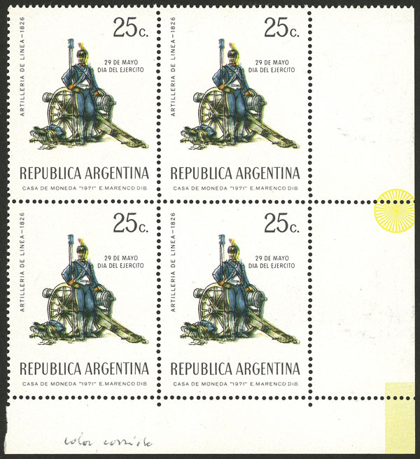 Soldier, corner block of 4 with VARIETY: Shifted colors, resembling a double impression, VF (Image)