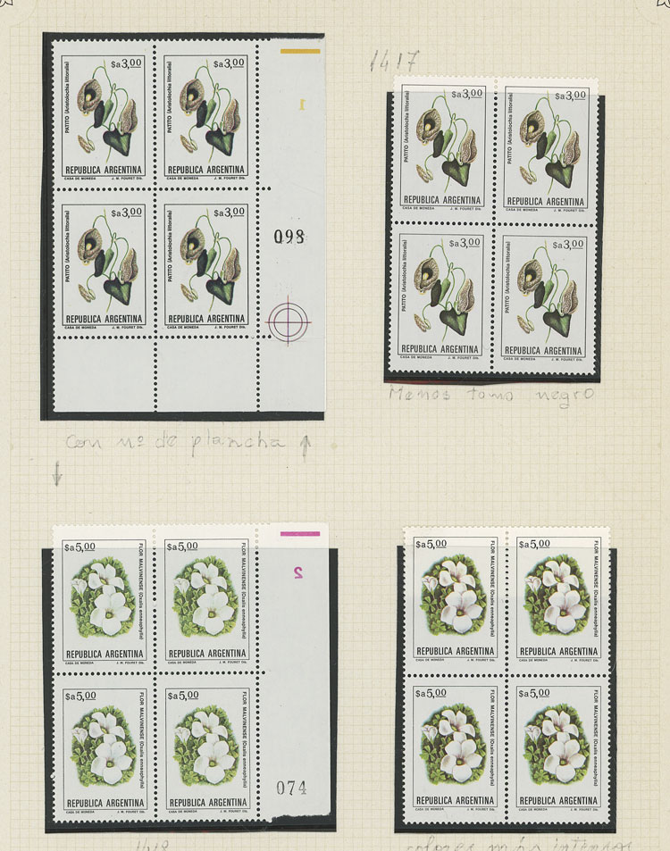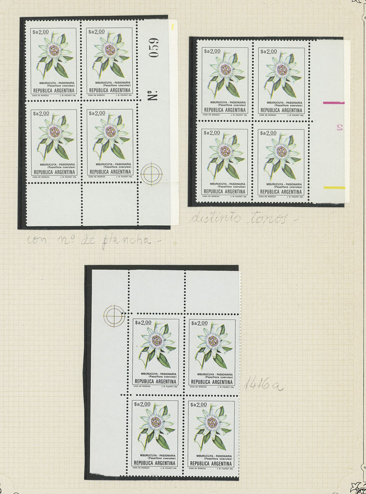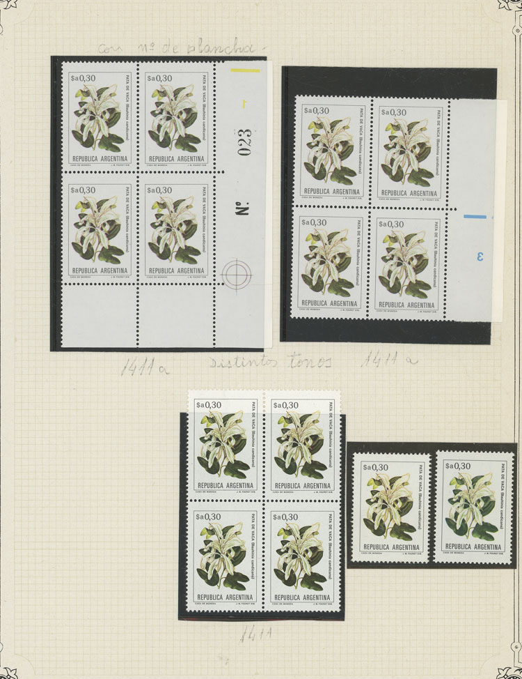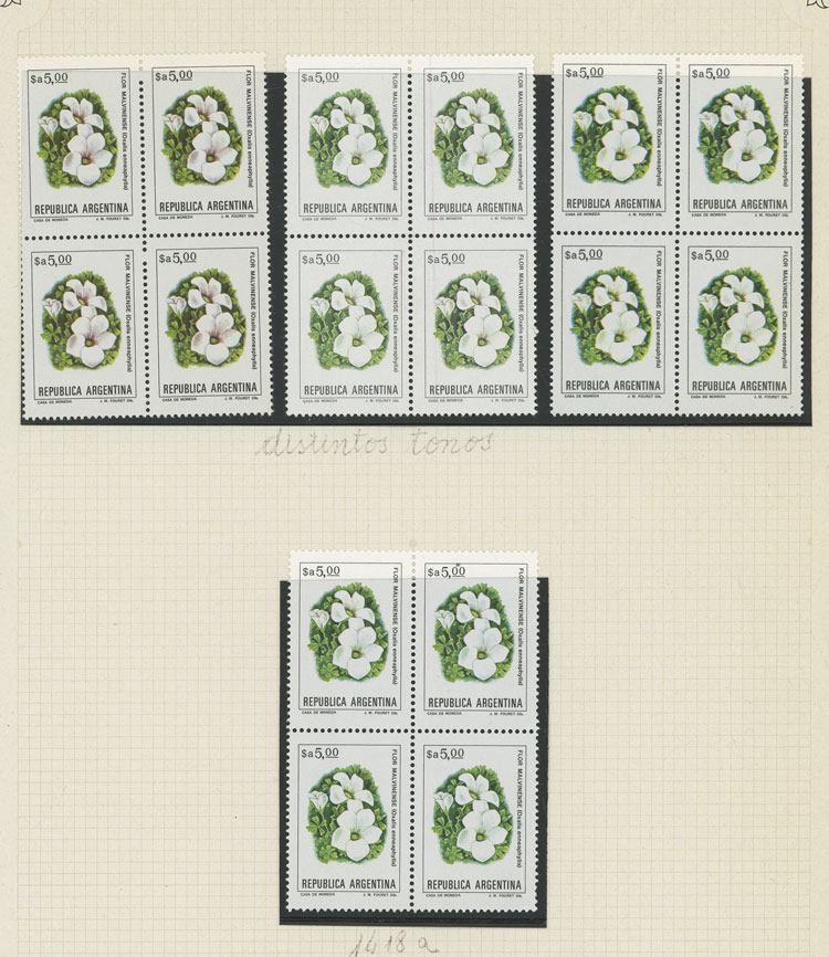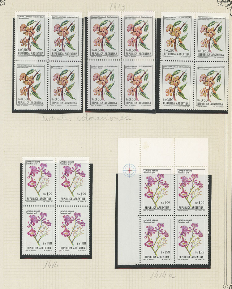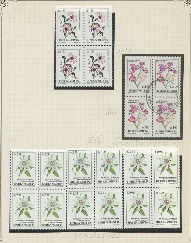 GJ.2101 + other values, Flowers (in Pesos Argentinos), study of 10 different values of the set on album pages, there are different shades and minor varieties, most in MNH blocks of 4 and of excellent quality (Image) (Image-02)