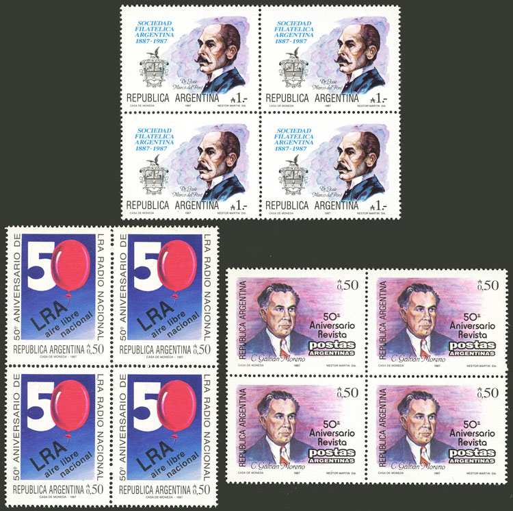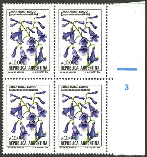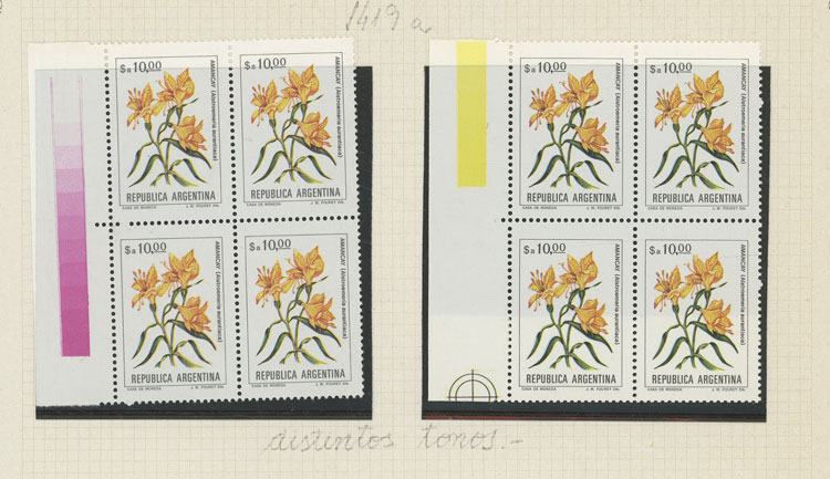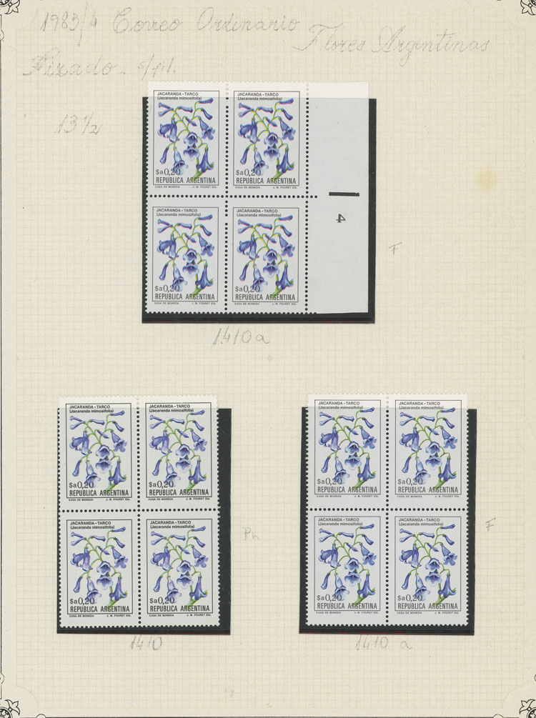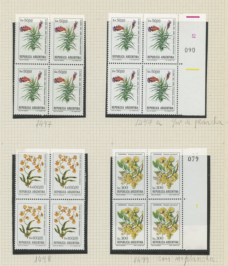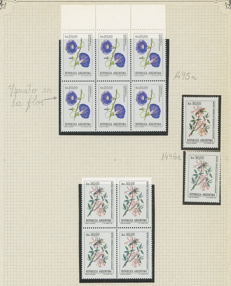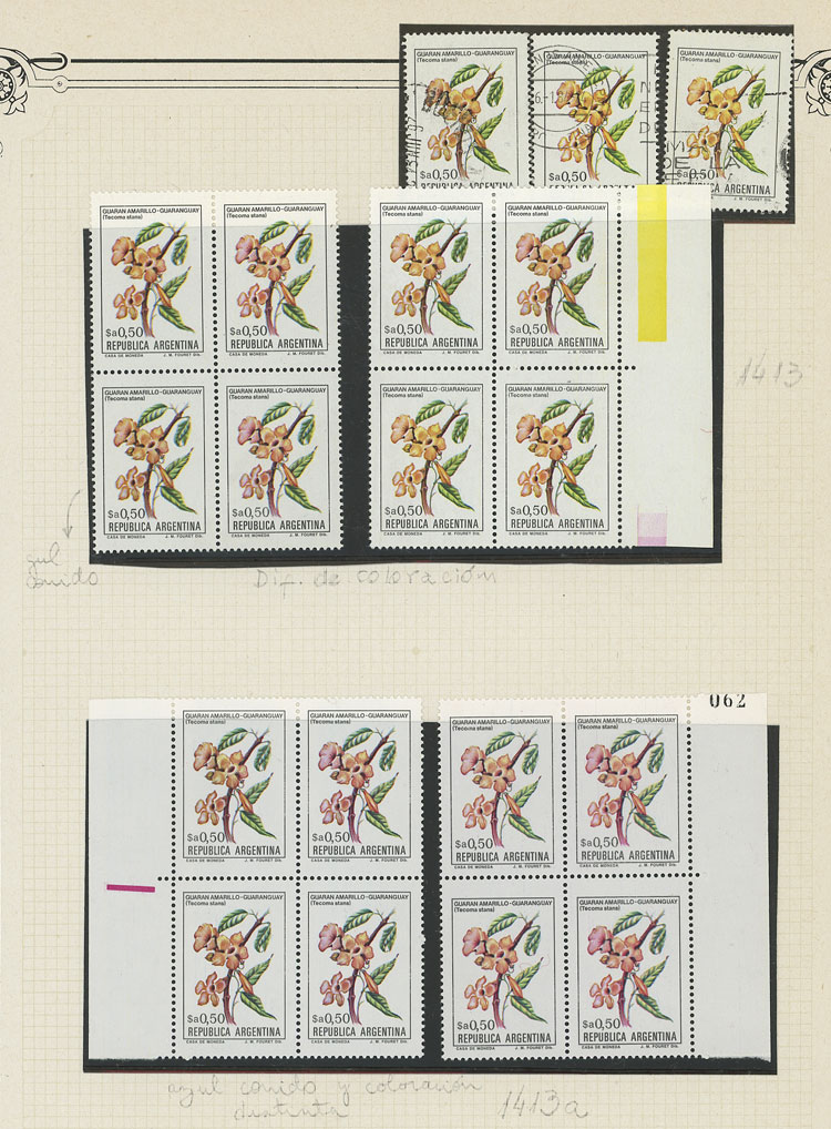 GJ.2101 + other values, Flowers (in Pesos Argentinos), study of 10 different values of the set on album pages, there are different shades and minor varieties, most in MNH blocks of 4 and of excellent quality (Image) (Image-02)