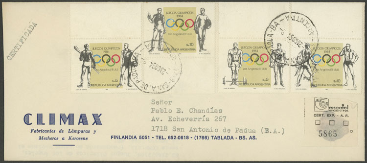 GJ.2166/2169, Olympic Games, cmpl. set of 4 values franking a registered cover used on 2/AU/1984 (Image)