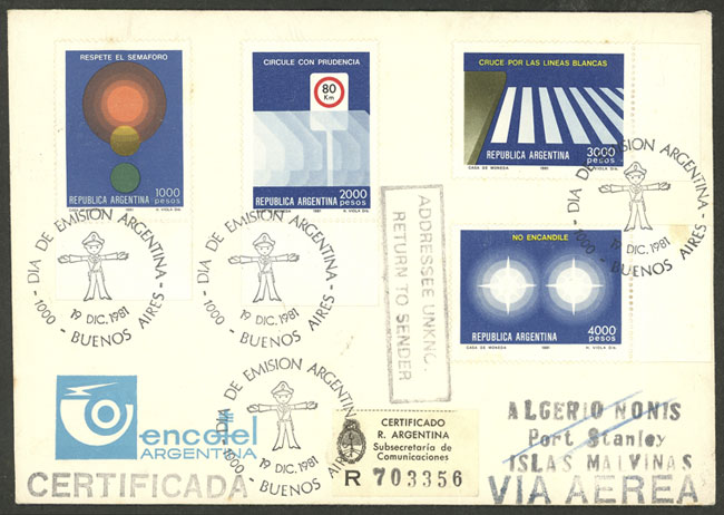 GJ.2010/2013, Traffic signs, cmpl. set of 4 values franking a registered cover, with first day postmark, sent from Buenos Aires to Falkland Islands on 19/DE/1981, with "Declaración Conjunta" mark with "4" (21/JA/82), the cover also bears