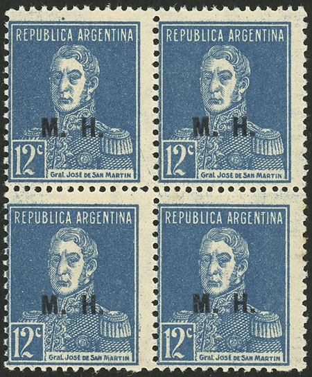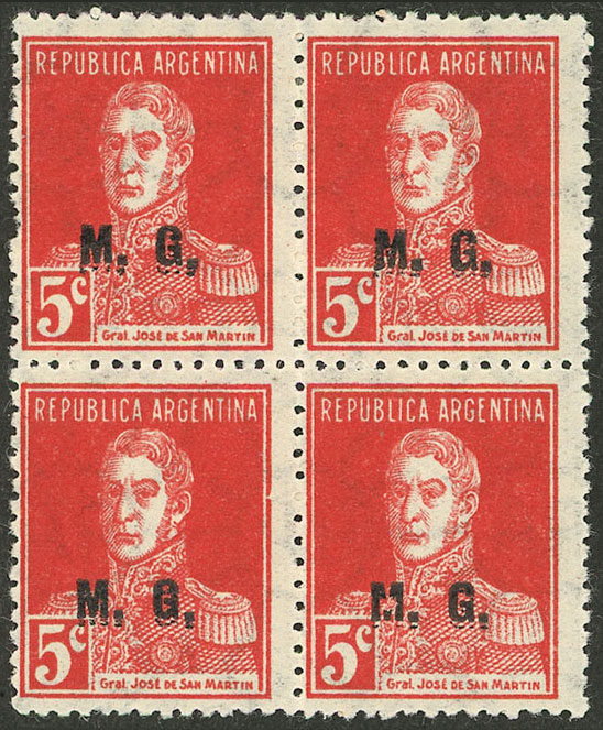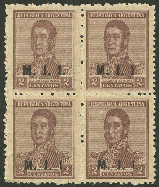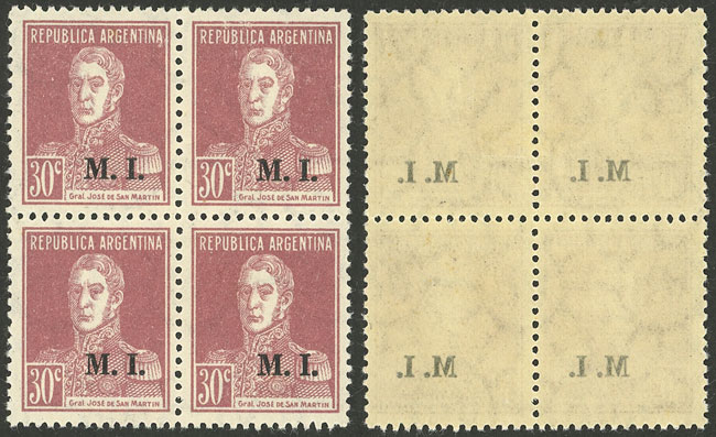 block of 4, all the stamps with DOUBLE overprint, one with additional variety: "M" broken, excellent quality (Image)