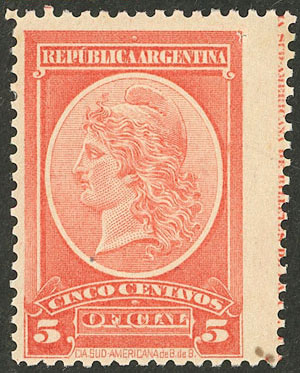 perf 11½ x 12¼, with VARIETY: right vertical perforation shifted and diagonal (stamp MUCH WIDER than normal, part of the printer imprint is in the margin) (Image)