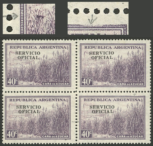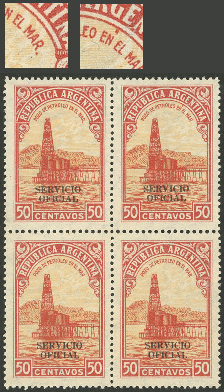block of 4, the top stamps with VARIETIES: left one with period after "MAR.", and right one with color spot above "N" of EN, VF quality (Image)