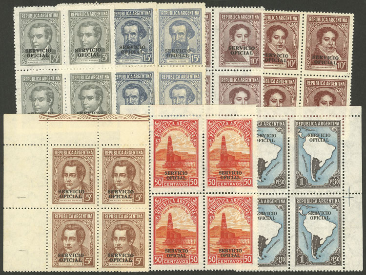 GJ.651/53 + 658/59 + 679/81, Proceres & Riquezas I, "Servicio Oficial" ovpt., cmpl. set in blocks of 4 with straight rays wmk, one with light staining