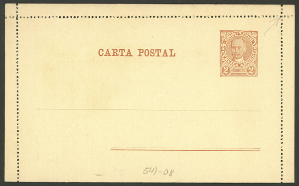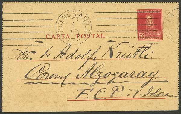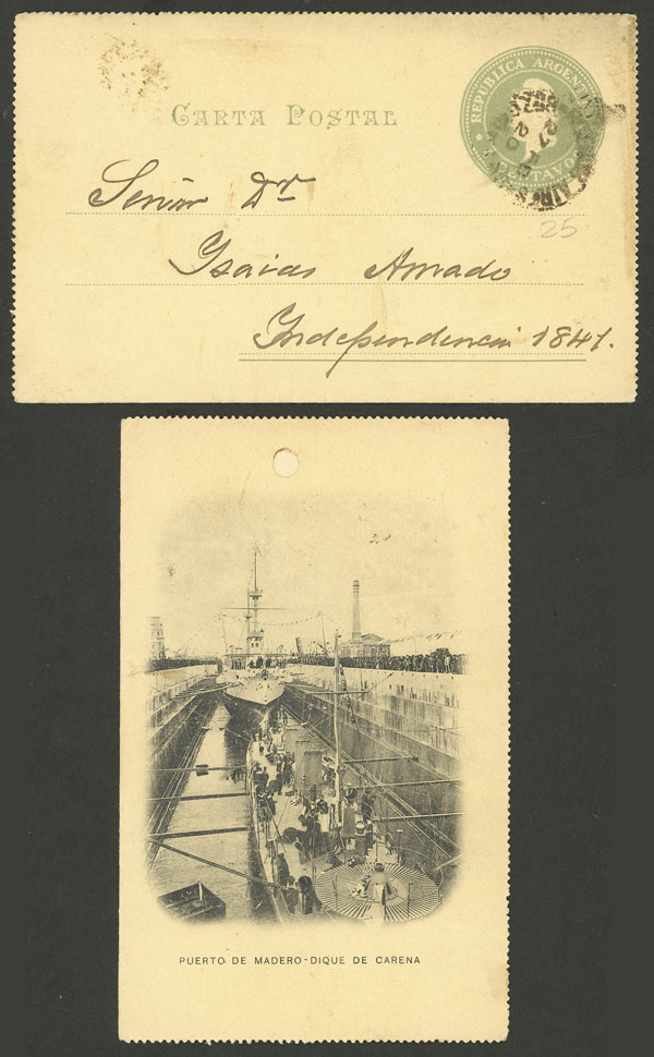 4c. lettercard (dock, ships) used in Buenos Aires on 27/FE/1920, filing hole (Image)