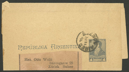 4c. wrapper, sent from Buenos Aires to Zurich (Switzerland) on 11/JUN/1896 (Image)