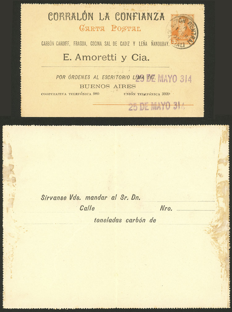Lettercard (CAP-20), with private impression inside to place orders for coal, used in B.Aires on 12/JA/1895 (Image)