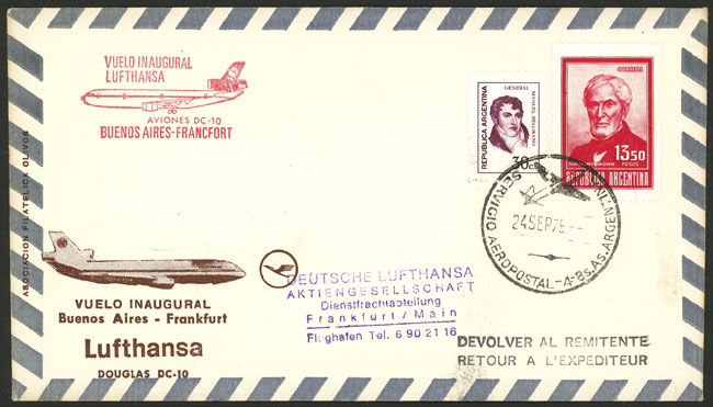 FIRST FLIGHT: Cover flown from B.Aires to Frankfurt (Germany) on 24/SE/1975 by Lufthansa (Douglas DC-10) (Image) (Image-02)