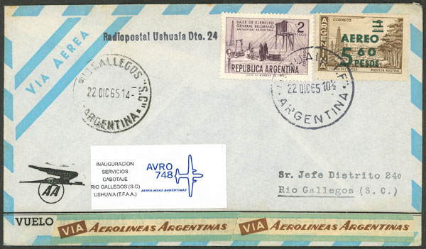 FLIGHT: Cover sent from Ushuaia to Río Gallegos on 22/DE/1965, on the first domestica flight of Aerolíneas Argentinas (Image)