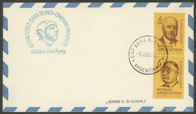 flown from Bahia Blanca to Comodoro Rivadavia on 1/NO/1964, with handstamp "40° Aniversario Vuelo - Antoine de Saint Exupery" (Image)