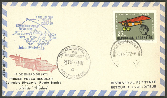 sent from Comodoro Rivadavia to Falkland Islands on 12/JA/1972, with mark of inauguration of regular flights, returned to sender, with "Declaración Conjunta" handstamp