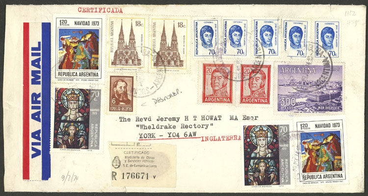 Registered airmail cover sent from Buenos Aires to England on 29/JUN/1974, with fantastic multicolor postage that includes the $300 Mar del Plata, one stamp with defect (Image)