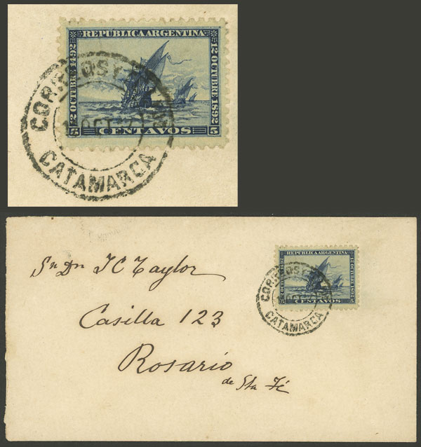 GJ.136, 1892 5c. Discovery of America 400 years, on FDC cover sent from CATAMARCA to Rosario, excellent quality! (Image) (Image-02)