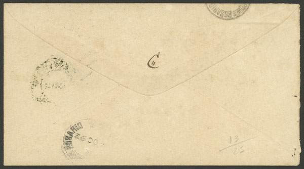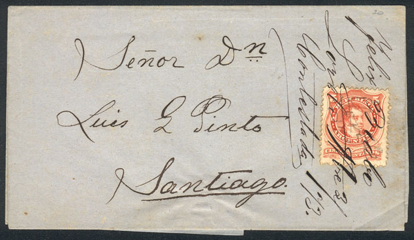 sent to Santiago (del Estero), franked by GJ.38 with scarce pen cancellation of LORETO, and over it an inscription of the addressee indicating date of reply 3/NO/1873, VF and extremely rare! (Image)