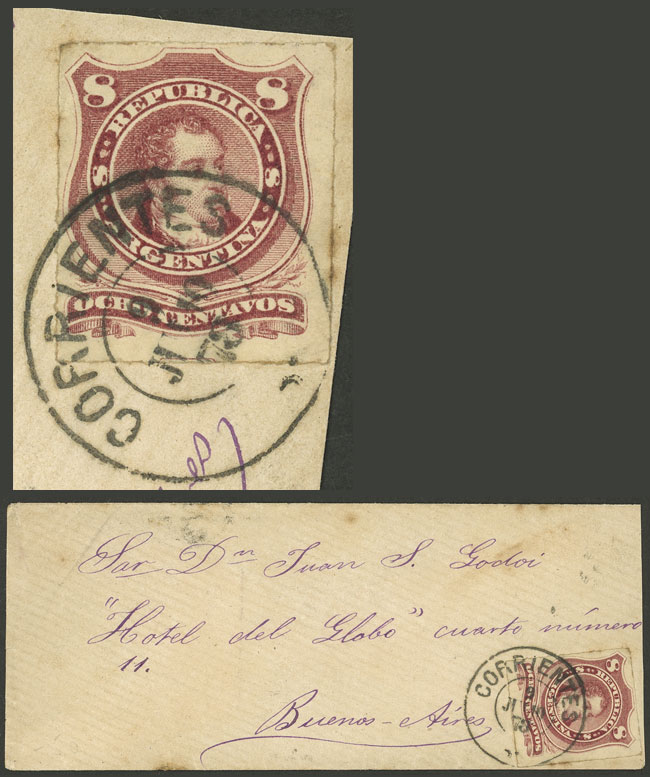 GJ.49, Rivadavia 8c. franking a cover sent to B.Aires on 9/JUN/1878, with spectacular double circle cancel of CORRIENTES, arrival backstamp, very fine quality, market value US$120 (Image) (Image-02)
