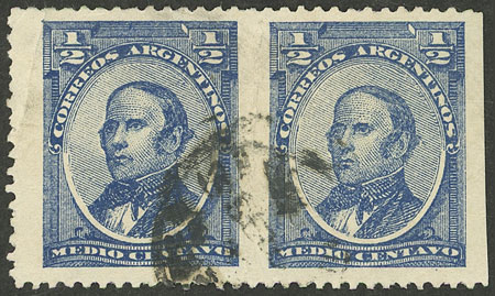 1888 ½c. Urquiza, pair IMPERFORATE VERTICALLY, used, with a central crease of little importance, very fine appearance, extremely rare! (Image)