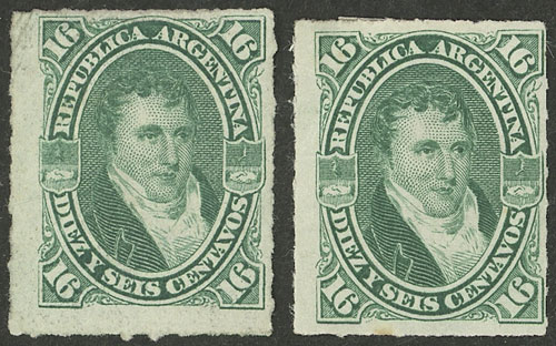 1876 16c. Belgrano, rouletted, 2 stamps on thin and normal papers, mint original gum, VF quality! (Image)