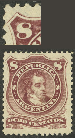 1877 8c. Rivadavia, type I (double frame line), mint with original gum, VF quality, rare! (Image)