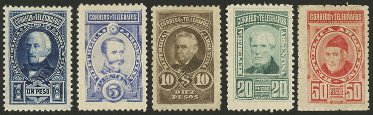 GJ.115/119, 1889 Sudamericana issue, the 5 high values of the set including the 2 unissued values of 10P. and 50P. signed by Victor Kneitschel on back, rare lot, VF quality! (Image)