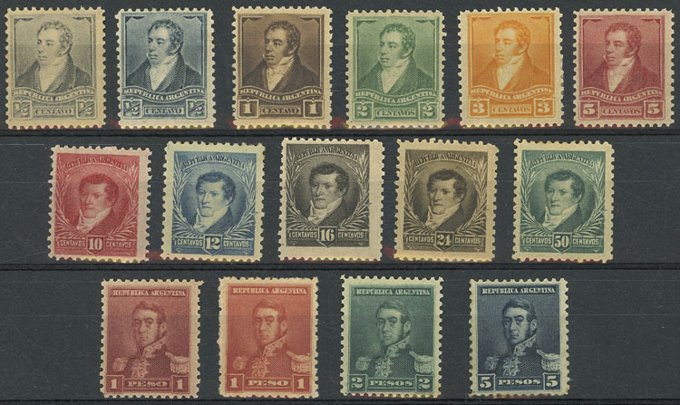 GJ.137/151, 1892 Rivadavia Belgrano & San Martín, with small sun watermark and perf 11½, complete set of 14 mint values (of the ½c. we include 2 colors), VF quality! (Image)