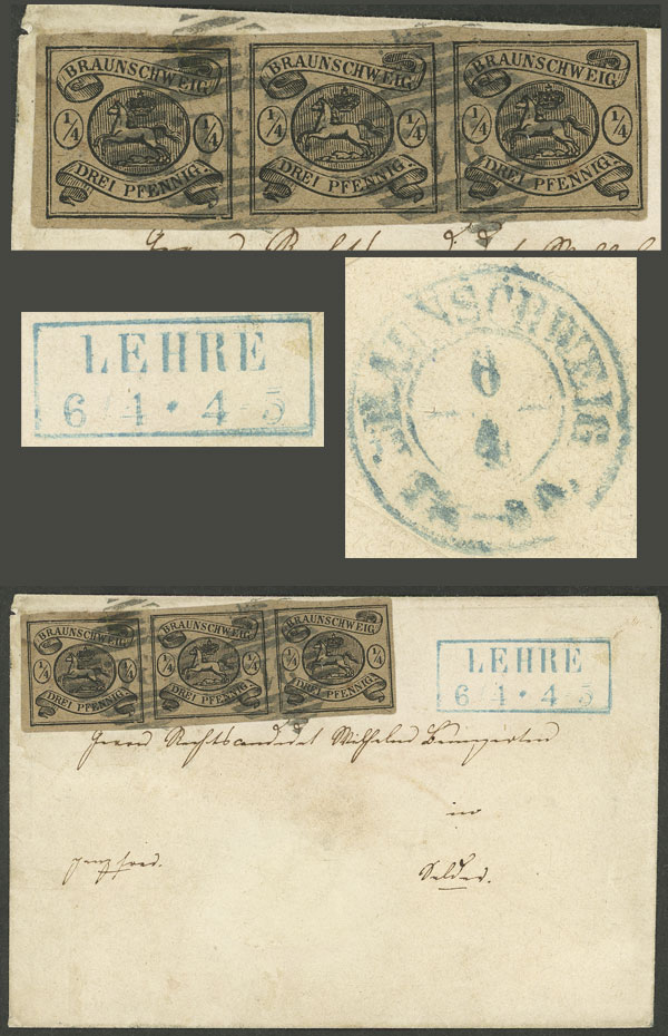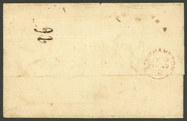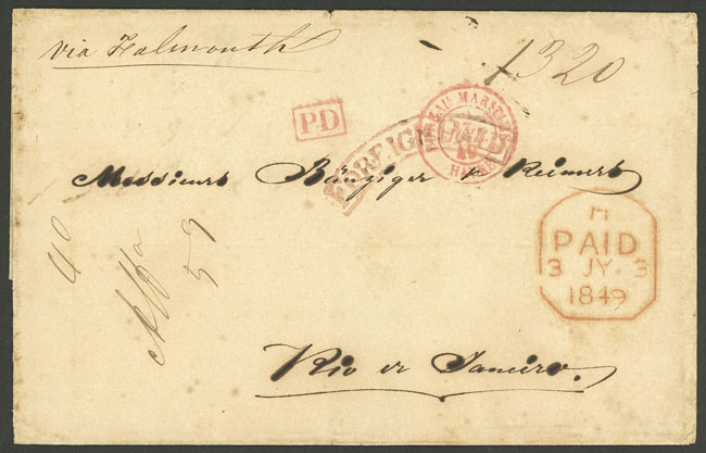 27/JUN/1849 Frankfurt - Rio de Janeiro: Folded cover sent via Falmouth, with varied markings on front and back (Southampton transit on 3/JUL), excellent quality, rare! (Image) (Image-02)