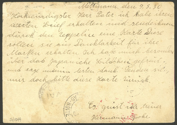 18/MAY/1930 Friedrichshafen - JAPAN, card franked by Sc.C38, sent to South America by Zeppelin flight with final destination JAPAN, it bears an interesting USA railway PO cancel: "PITTS & ST. LOUIS R.P.O. - 25/JUN", with minor defects