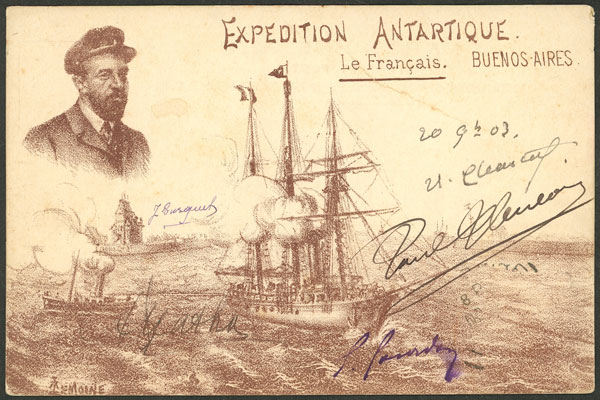Postcard of the Antarctic expedition led by Charcot on his ship Le Français, edited during his stay in Buenos Aires, WITH THE HAND-WRITTEN SIGNATURES of Charcot and members of the crew A. Matha, J. Turquet, Paul Pleneau and E. Gourdon,