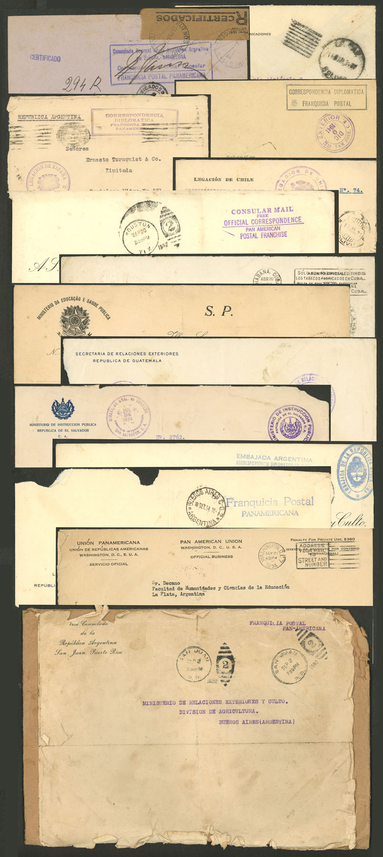 PAN-AMERICAN CONSULAR POSTAL FRANCHISE + official mail: 14 Official covers sent between 1932 and 1941 from foreign embassies and consulates, all with postal franchise, some very scarce and interesting, including covers sent from Cuba,