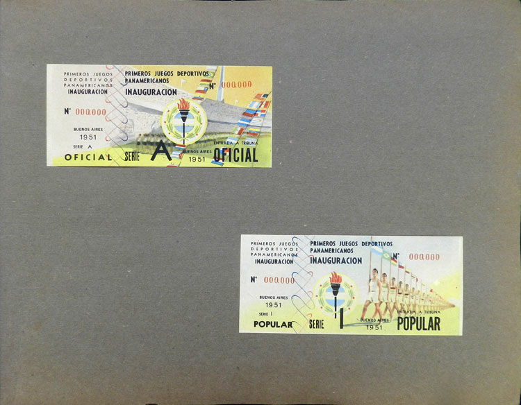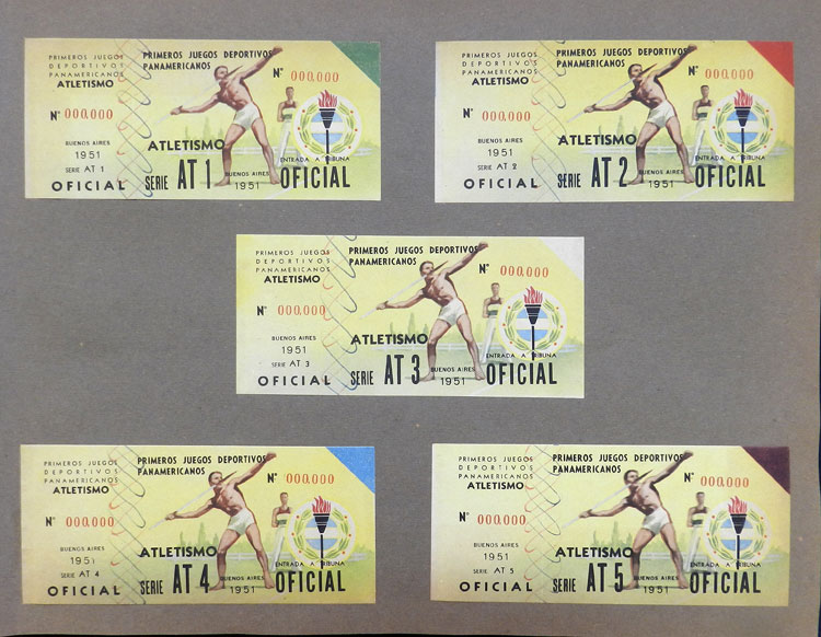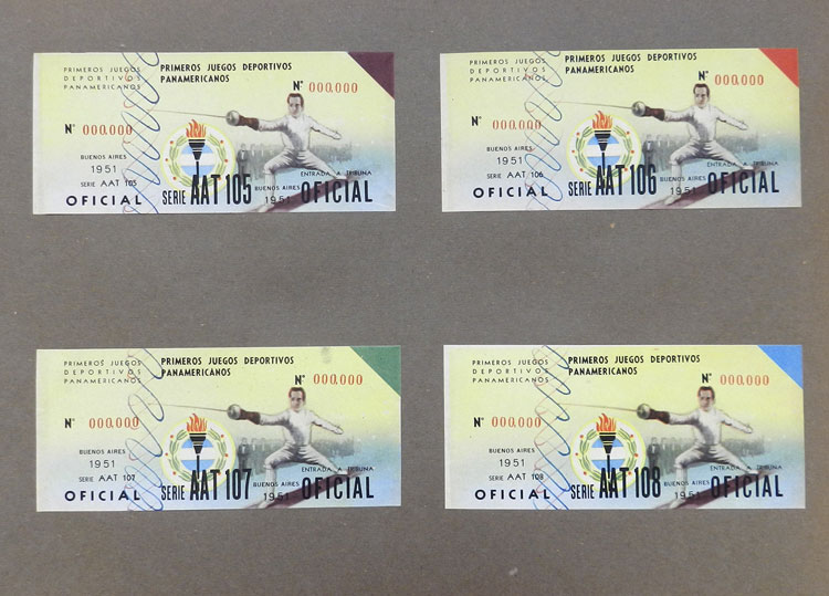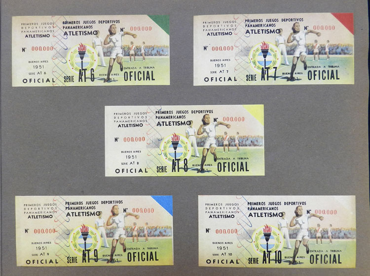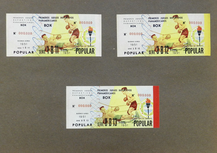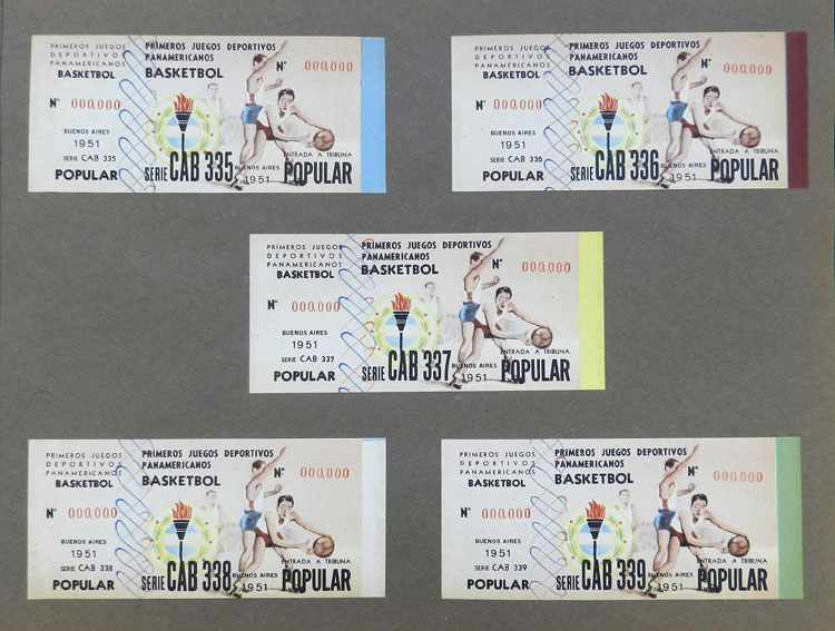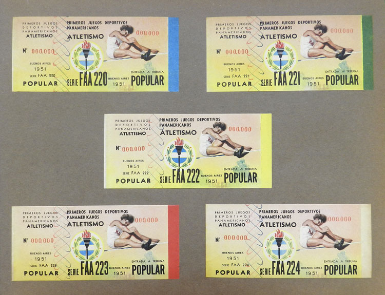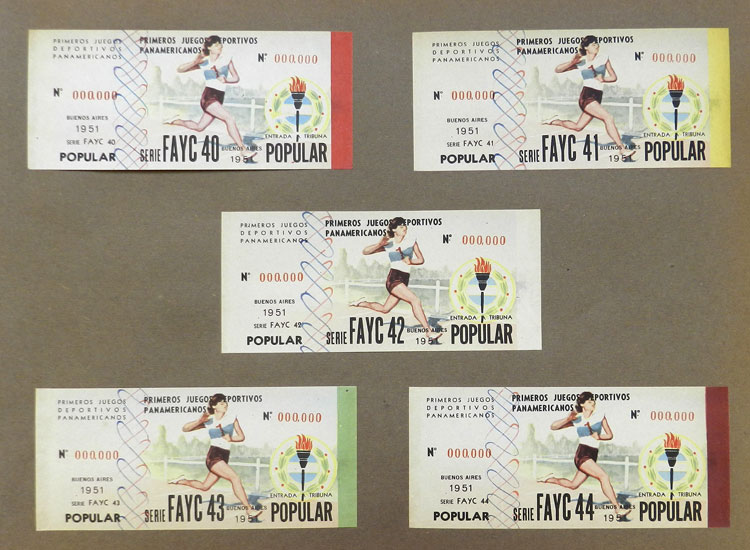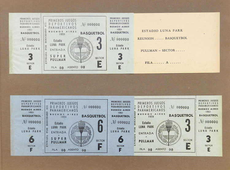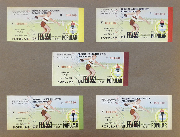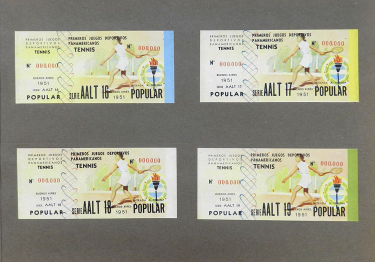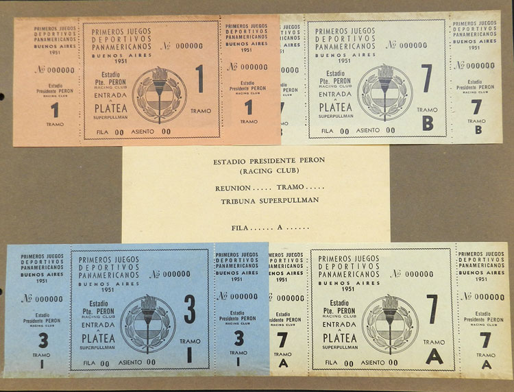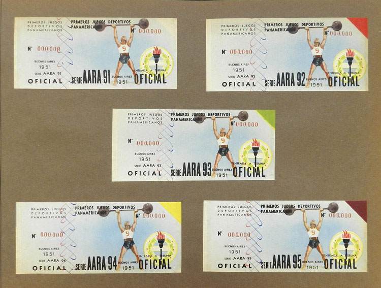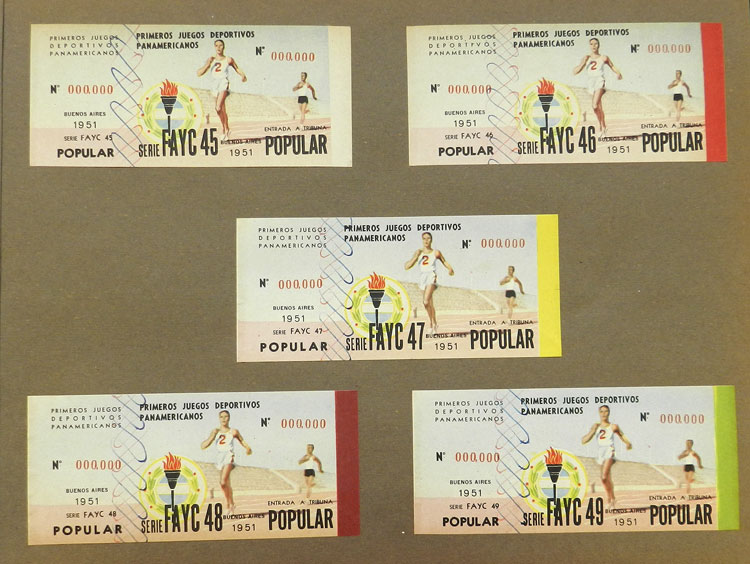 First Pan-American Games to be held in Buenos Aires in 1951, book with samples of entry tickets, it includes 249 ticket samples (all different) for the inauguration and the following sports: track and race, marathon, horse riding,