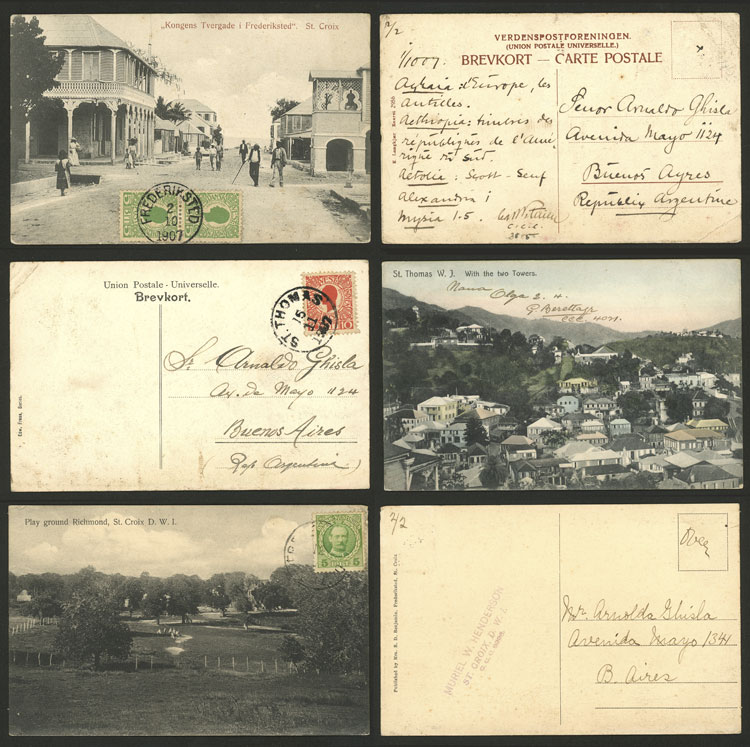 RARE DESTINATION: 3 Postcards sent to Argentina in 1907/8, from Frederiksted (2) and St. Thomas, excellent quality! ATTENTION: Please view ALL the photos of the lot, because all the content has been scanned (both sides) (Image) (Image-02)