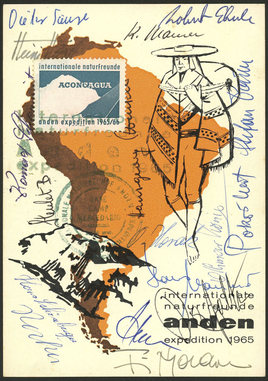 Expedition to Aconcagua (Andes) in 1965, postcard with special cinderella, and a number of signatures of the members of the expedition, excellent quality!