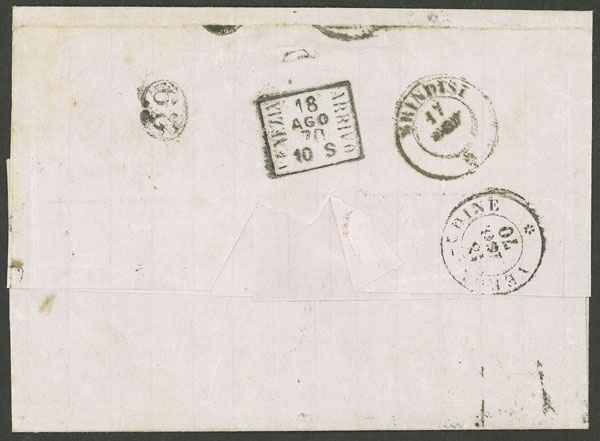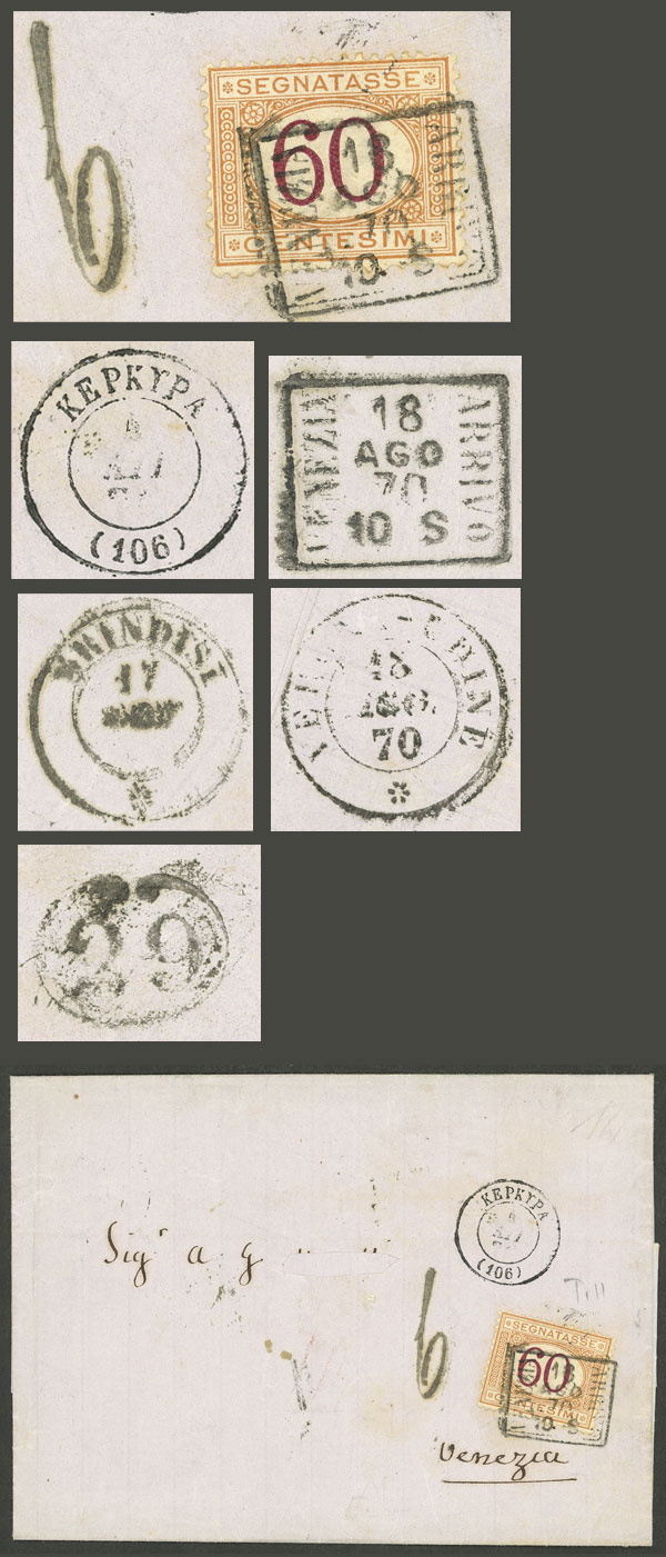 16/AU/1870 CORFU - Venezia, folded cover sent without postage, with dispatching double circle cancel of "KEPKYPA (106)" with date, and several transit and arrival backstamps, postage due stamp of 60c. (Sc.J11) applied on arrival, the last