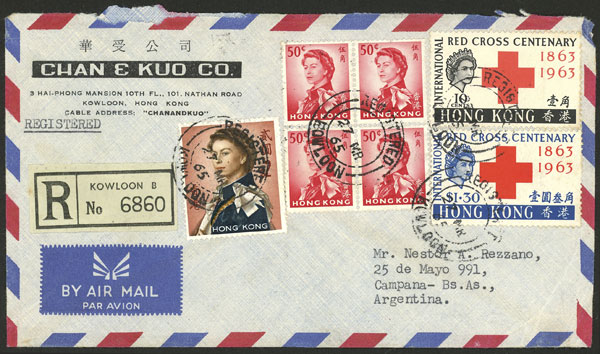 Registered airmail cover sent from Kowloon to Argentina on 27/MAR/1965 with very attractive postage, VF! (Image) (Image-02)
