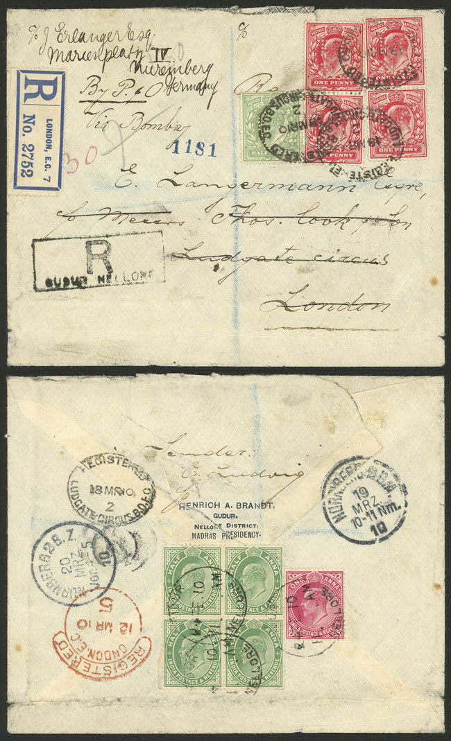 POSTAGE, perfins, etc.: Registered cover sent from NELLONE to Ludgate Circus (England) on 2/FE/1910, franked on back. It arrived in London on 12/MAR, and to destination on 18/MAR, where it was re-franked with British stamps (on front, with perfins "T