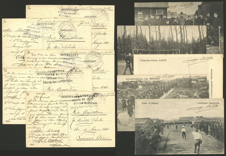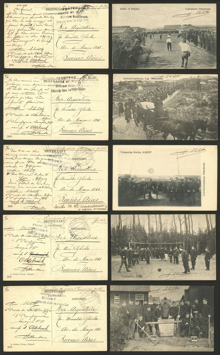 POSTAL FRANCHISE OF BELGIAN PRISONER, UNUSUAL DESTINATION: 5 Spectacular postcards with views of activities in the internee camp of Oldenbroek sent to Argentina on 3/NO/1918 with postal franchise, all with datestamps of the camp and