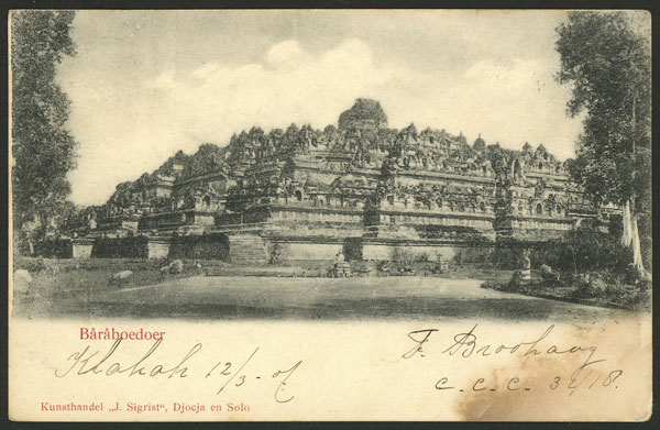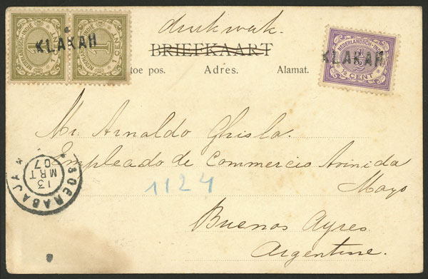 Postcard sent to Argentina on 12/MAR/1907 franked with 2½c., cancelled by straightline "KLAKAH", and with transit mark of Soerabaja 13/MAR, rare destination!