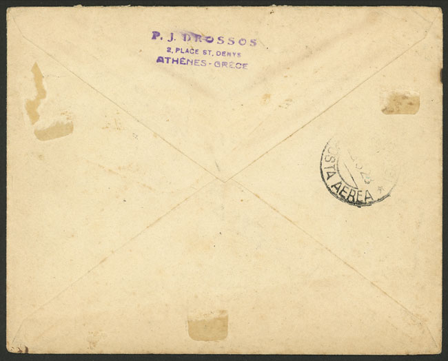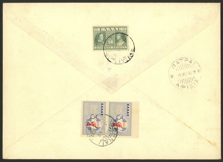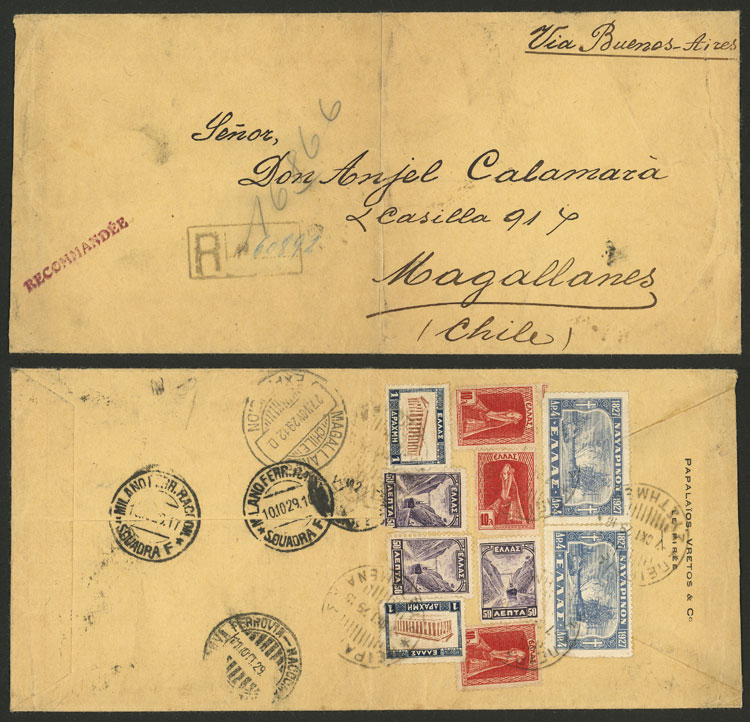7/OC/1929 El Pireo to Magallanes (Chile), registered cover with colorful postage on back, and transit marks of Milano 10/OC, Genova 11/OC, and arrival of Magallanes 27/NO, VF quality, very interesting! (Image)