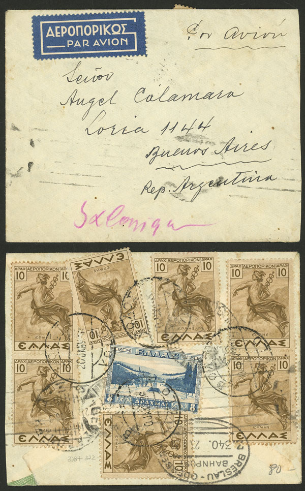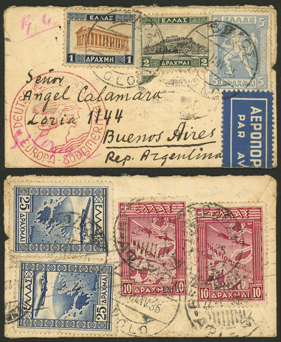 21/JA/1935 Volo - Argentina, small airmail cover with good franking of 78d. including Sc.C20 x2 (1933 25d., second high value of the set), sent via Germany DLH, arrival mark of Buenos Aires (illegible date), very fine quality! (Image)