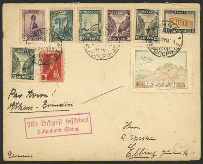 28/JUN/1928 First flight Athens - Brindisi, very nice multicolor franking, arrival backstamp, VF! (Image) (Image-02)