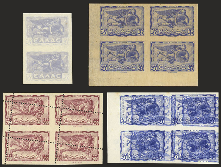 58, 1942/3 50d. ultramarine, imperforate block of 4 printed on the gum + imperf pair with faint impression + imperf block of 4 with double impression (without gum) + Yert 60 in block of 4 with VERY SHIFTED PERFORATION, excellent quality! (Image)