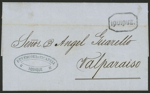 23/DE/1868 Iquique to Valparaiso, entire letter with interesting commercial text about the sale of saltpeter, without franking and with framed "IQUIQUE" mark perfectly applied, excellent quality! (Image)