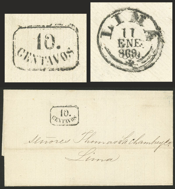Entire letter sent from Caldera to Lima on 5/JA/1869 without franking, with postage due mark of 10c. and arrival backstamp (11/JA), excellent quality!