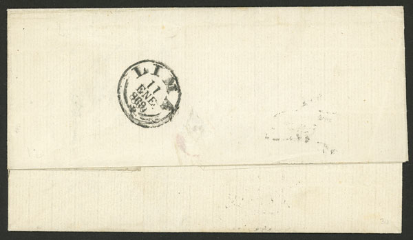 following day. Excellent quality, ex-Herbert Moll. The new postal rate for letters to Europe was 11c. (of which 1c. paid the transit across the Isthmus of Panama). This amount was expressed in Moneda de Plata, for which no stamps yet existed, and the