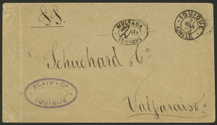 Cover sent to Valparaiso on 21/MAR/1889, without franking, with datestamp of IQUIQUE and postage due mark of 2c., arrival backstamp of 26/MAR, excellent quality! (Image) (Image-02)
