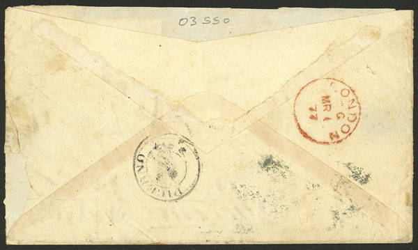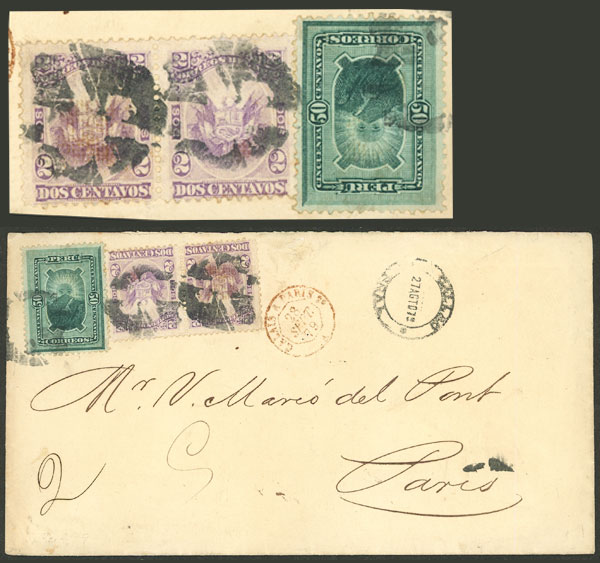 27/AU/1876 Callao to France, entire letter franked with 10c. (pair Sc.16), it was handed directly to the British Consulate and there the Peruvian stamps were cancelled with the mark "C38", it bears several interesting marks on front and