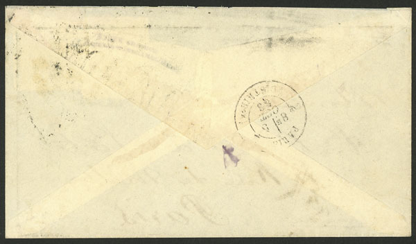RATING: Cover sent from Chimbote to France in NO/1880 franked on back 36c. with stamps overprinted "PLATA-PERU", it bears a transit mark of Panama 28/NO and Paris arrival for 25/DE, very rare, VF quality, ex-Herbert Moll. (Image)