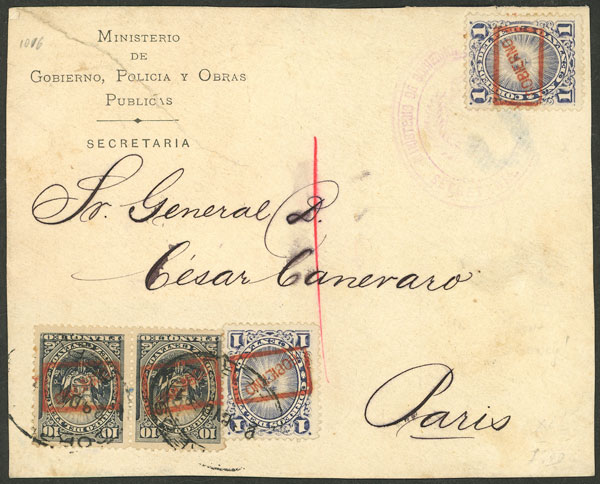 an official cover sent from Lima to Paris on 29/DE/1891 franked with 22c. (double rating) with official stamps (Sc.O5 pareja + 2x O2), very fine quality, ex-Herbert Moll.