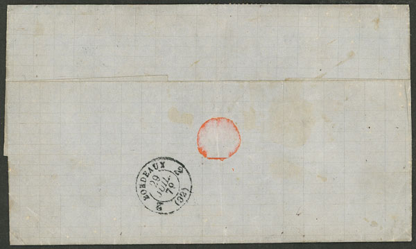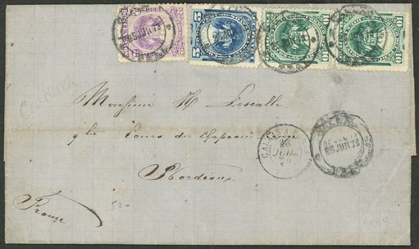 Entire letter sent on 25/JUN/1879 (ONLY 8 DAYS AFTER PERU´S ACCESSION TO THE UPU) from Callao to France franked with the new international rate of 27c., with transit through Calais on 28/JUL, and on back Bordeaux arrival mark of the