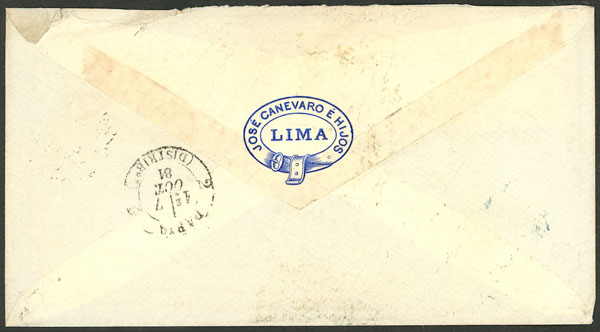 7/SE/1881 Lima to France, cover franked with 11c., stamps overprinted "PLATA-LIMA", with Paris arrival mark of 7/OC, excellent quality, ex-Herbert Moll